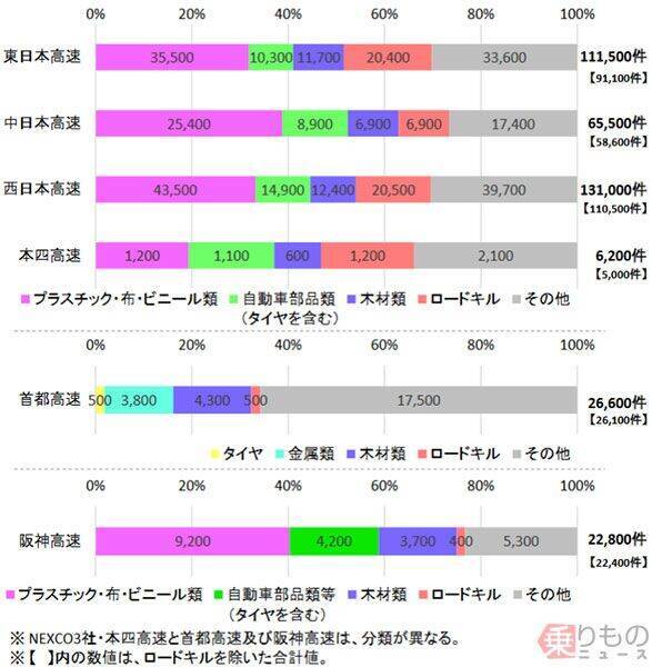 高速道路の落下物ランキング 1位:プラスチック・布・ビニール類 9万9900件 2位:自動車部品類(タイヤを含む) 3万3600件 3位:木材類 3万900件 最も多い落下物は、「プラ